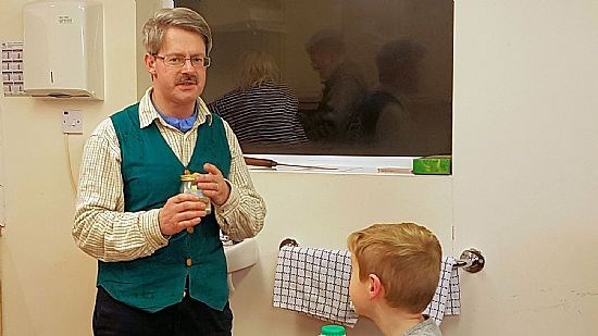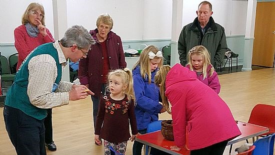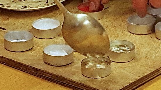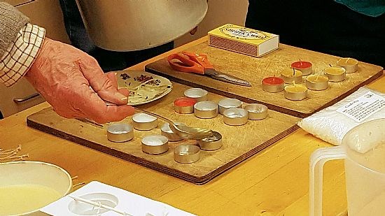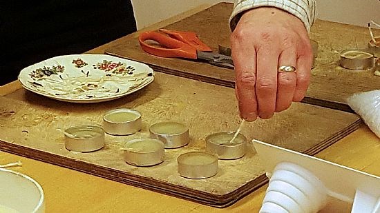 The group’s first task was to make some small candles called tea lights. This operation was delegated to ‘responsible adults’ who carefully spooned the melted wax into moulds. That was the easy bit. Next it was the children’s turn, to insert short wicks into the wax and then hold them steady until the wax solidified.